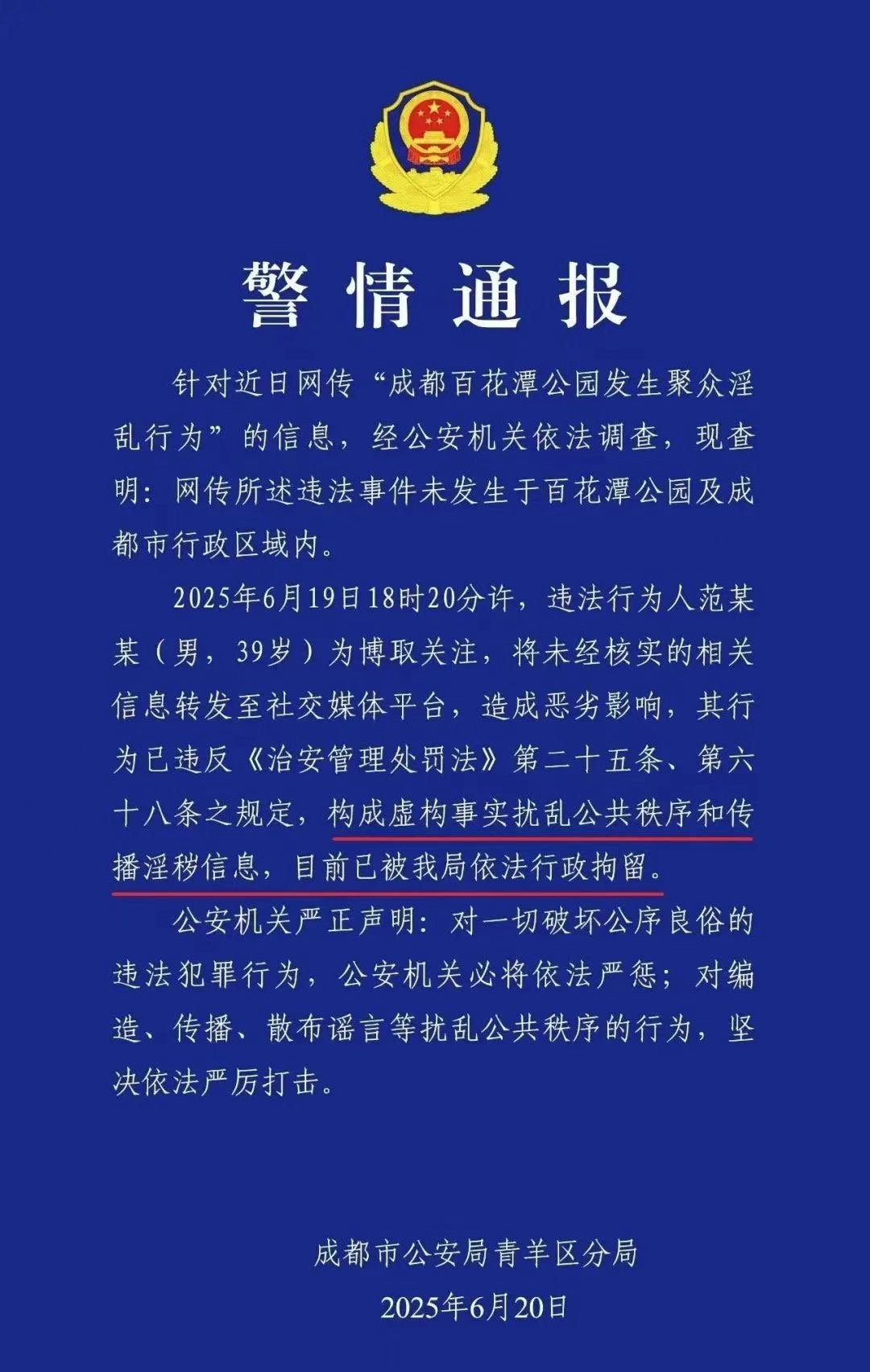 2025 年 6 月 19 日,一则关于 “成都百花潭公园多名男子聚众,被监控全程录像” 的消息在多个社群中流传,伴随所谓 “辣眼” 视频的传播,迅速引发广泛关注,后有网友反馈称,事发地可能是北京牡丹园。在信息传播高度便捷的当下,网络平台成为信息流通的主渠道,却也为谣言滋生提供了“温床”。范某某为博取关注,未经核实便转发虚假信息,短短时间内,谣言借助社交平台的传播力,迅速扩散。从传播学角度看,这类负面、猎奇信息往往具备更强的传播“黏性”,公众在好奇心驱使下,不自觉成为谣言的“二传手”。从社会层面看,“非法聚众”这类违背公序良俗的虚假信息,冲击社会道德底线,引发公众不安与焦虑,扰乱社会公共秩序,消耗社会信任资本。若任由谣言肆意传播,小到个体声誉、场所形象,大到社会稳定、法治根基,都会遭受侵蚀,如同“信息病毒”,在网络生态中蔓延,破坏健康的信息传播环境。 成都市公安局青羊区分局的快速行动,彰显法治力量。经调查,迅速查明谣言与成都本地无关,锁定违法人员范某某,依据《治安管理处罚法》相关规定,对其依法行政拘留。这一处理,体现了法治的精准性与威慑力。《治安管理处罚法》作为维护社会秩序的重要法律武器,第二十五条针对虚构事实扰乱公共秩序、第六十八条针对传播淫秽信息的规制,为打击此类网络谣言提供明确法律依据。公安机关严格依法办案,从调查取证到处罚执行,遵循法定程序,让法治精神落地。这不仅是对违法个体的惩处,更是向社会传递清晰信号:网络空间不是法外之地,任何妄图挑战法律权威、扰乱公共秩序的行为,都将付出代价。法治如同坚固盾牌,守护社会秩序,更守护公众对公平正义的信仰。此次谣言事件,也为网络秩序维护敲响警钟,凸显多方协同治理的必要性。 对公众而言,提升媒介素养是关键。在信息洪流中,应培养理性判断、质疑求证的习惯,不被猎奇内容牵着走,不盲目转发未经核实信息。当每个人都成为网络秩序的“守护者”,谣言的生存空间将大幅压缩。学校、社区可加强宣传教育,普及网络法律知识与信息辨别技巧,从源头提升公众“免疫力”。成都“聚众淫乱”谣言事件,是网络时代社会治理的一个缩影。它让我们反思,在追求信息自由传播的同时,如何平衡自由与秩序、权利与责任。法治是底线,明确行为边界,惩治违法;道德是高线,引领社会风尚,倡导公众自觉维护公序良俗。只有法治与道德协同发力,才能构建清朗网络空间,守护社会和谐稳定,让类似谣言事件越来越少,让网络真正成为服务社会、传递正能量的平台,助力社会在健康轨道上前行,书写法治中国与网络文明建设的新篇章。 |