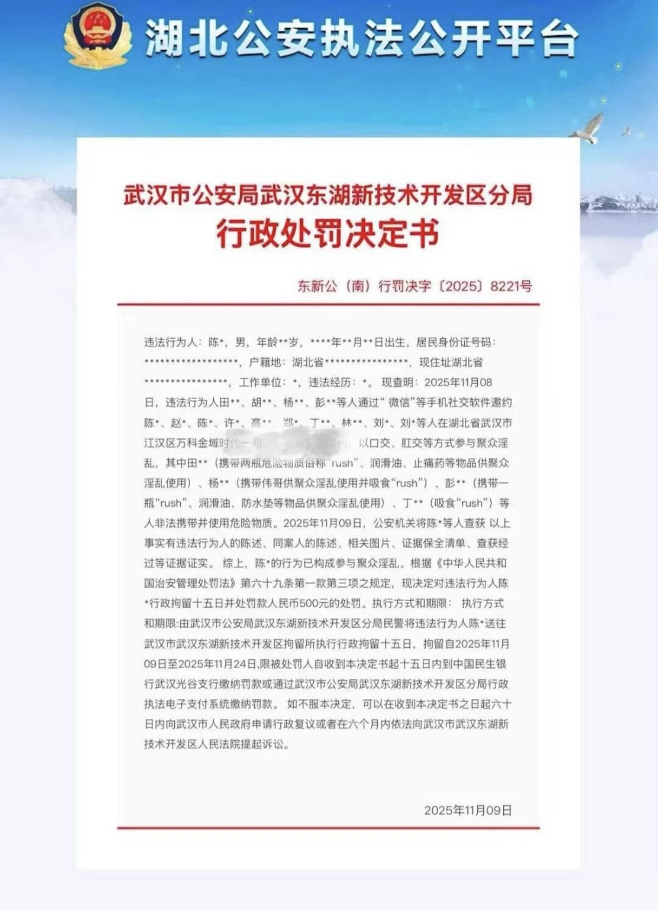 近日,就有多名同志爆料说,圈内知名网红胡宾果涉嫌聚众淫乱被抓,相关聊天记录在微博等平台流传,引起了许多基友的注意。据GAY网了解到,胡宾果在微博上拥有 276 万粉丝,他自称美妆博主。此前,他曾因一系列争议事件登上微博热搜,引起网友的关注。早在 11 月 10 日凌晨,就有基友在GAY网上爆料说,胡某某被抓了。当时,有基友说,不喜欢胡某某的人很多,他经常组织聚会局,而且表现很高调,如果被抓的话,真是普天同庆。 还有基友讽刺说,胡某某的局全部是丑 X,因为好的货色都不会去有他的局,他还说“希望人有事。”聊天记录还显示,最近一段时间,胡某某曾组织过 4 起聚会,在郑州组局的时候,就差点被人举报。11 月上旬,胡某某在朋友圈发文暗示参加聚会的人有几个 1,几个 0,表现得比较高调。据一些基友猜测,“最后这次被人知道他们在哪个酒店举办的局,被逮到机会了,直接就举报了,全部逮起来了。” 据GAY网了解到,11 月 9 日当天,湖北公安执法公开平台公布了一份武汉市公安局武汉东湖新技术开发区分局的行政处罚决定书。经过查证,这份行政处罚决定书在官网上可以找到,并且可以正常打开和浏览,确定内容属实。 行政处罚决定书披露,2025 年 11 月 8 日,违法行为人田某某、胡某某、杨某某、彭某某等人通过微信等手机社交软件邀约陈某 2、赵某、陈某、许某、高某某、郑某、丁某某、林某某、刘某、刘某 2 等人在湖北省武汉市江汉区万科金域时代一期 X 栋 1069 室房间内,以口交、肛交等方式参与聚众淫乱。 从通报内容来看,以上出现的人名就至少有 14 人,这意味着在这个聚会中,至少有 14 人参加。在参与者中,还有人携带 RUSH、润滑油、止痛药、防水垫等物品,其中有多人携带 RUSH 并使用,这一行为也是违法行为。 2025 年 11 月 9 日,当地警方将以上人员全部抓获。由于参与者中有 “胡某某”,因此基友们推测这个胡某某应该就是拥有 276 万粉丝关注的网红胡某某。从时间线来看,胡某某等人于 11 月 8 日组局,11 月 9 日被抓,11 月 10 日圈内就传出消息了。 胡某某平时每天都会发微博,他的最后一条微博停更于 11 月 8 日 20 点。11 月 18 日和 19 日,胡某某的微博再次更新,但发布平台为“网页版”,并非他经常使用的 iphone17 手机,有基友猜测是胡某某的助理在更新他的微博。 此外,有基友还晒出胡某某的朋友圈,其最后一条动态也是 11 月 8 日。当天,他的定位在武汉,内容为 “哪位宝宝在武汉呢?我睡一觉,晚上见。”而他 11 月 7 日的朋友圈动态还在成都,内容为 “on prep,今晚来找我。” 11 月 19 日,GAY网小编登入湖北公安执法公开平台找到了胡某某的行政处罚决定书。内容显示,胡某某的行为已构成参与聚众淫乱。根据《中华人民共和国治安管理处罚法》第六十九条第一款第三项之规定,现决定对违法行为人胡某某行政拘留十五日并处罚款人民币 500 元的处罚。胡某某被送往武汉东湖新技术开发区拘留所执行行政拘留十五日,拘留自 2025 年 11 月 09 日至 2025 年 11 月 24 日。所以,胡某某要 11 月 24 日之后才能恢复自由身。 此事再次提醒各位圈内的基友,大家一定要遵纪守法,不要参加乱七八糟的局。尤其是一些所谓的网红或者名媛的局,更要小心谨慎。 |